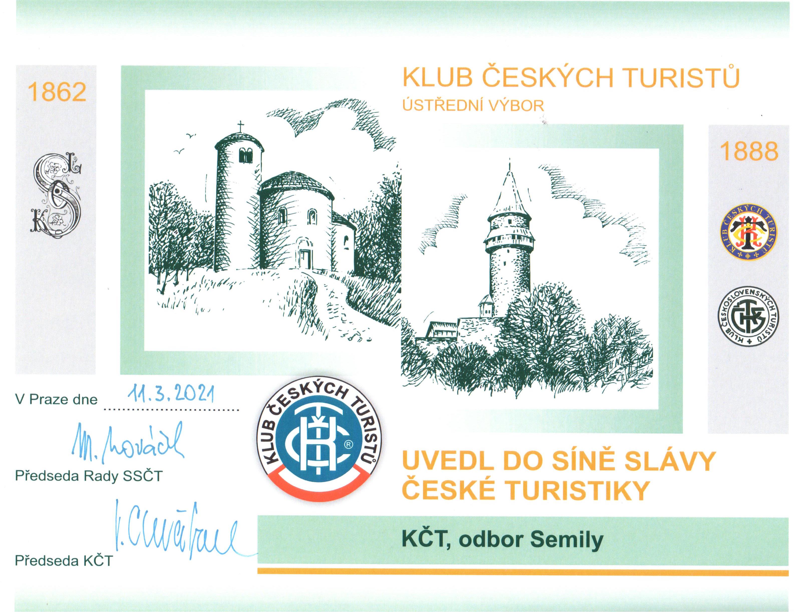 Ve čtvrtek 24. června 2021 se konalo slavnostní setkání našeho odboru za přítomnosti vrcholného představitele ústředí Klubu českých turistů ing. Mojmíra Nováčka. Za dlouhodobé kvalitní výsledky práce KČT odboru Semily, jejichž jedním z novodobých hlavních počinů bylo zorganizování a pořádání celostátní akce Za posledním puchýřem v listopadu roku 2018, jsme obdrželi ocenění formou Uvedení do síně slávy české turistiky.
